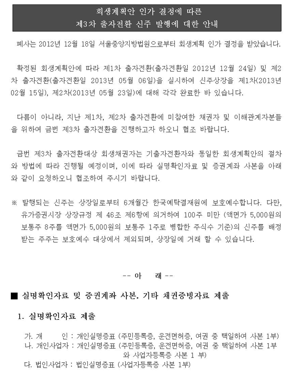 제3차 출자전환 신주 발행에 대한 안내