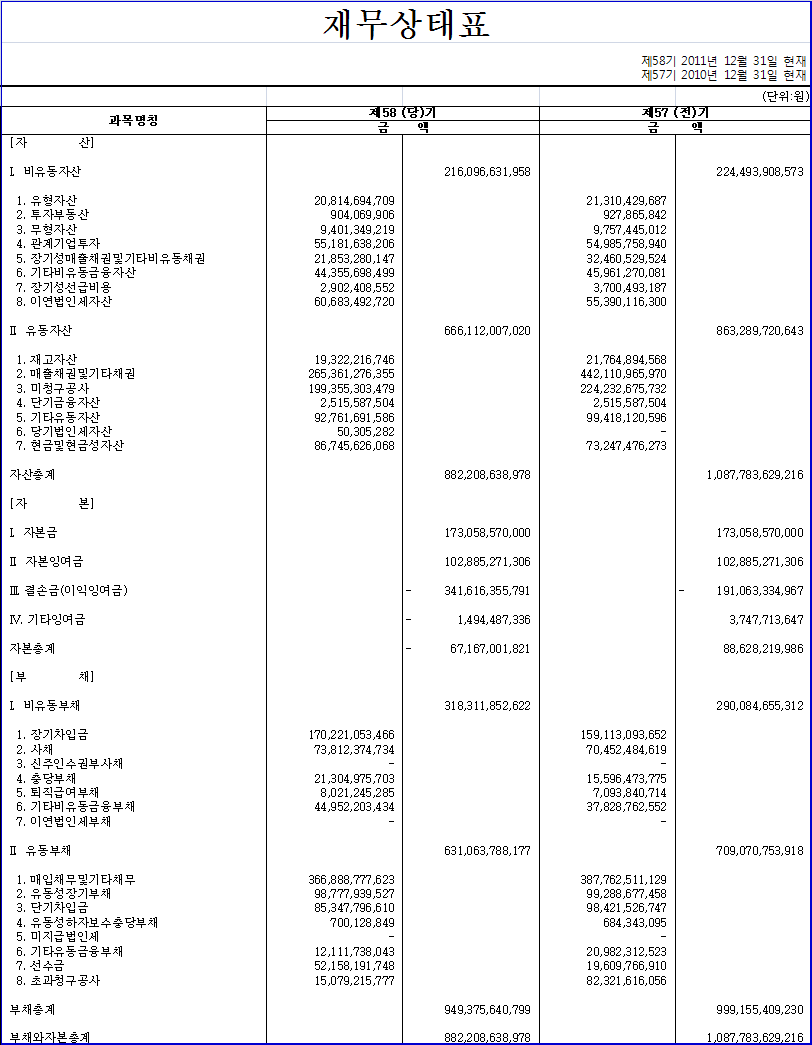 위와 같이 공고함 2012년 3월 30일 남광토건 주식회사 대표이사 강 호 치 감사의견 : 위 재무상태표를 포함한 제58기 재무제표는 한국채택국제회계기준에 따라 중요성의 관점에서 적정하게 표시하고 있습니다. 한영회계법인 대표이사 권승화