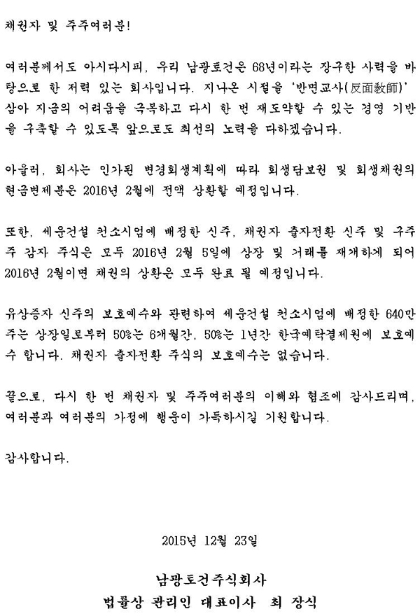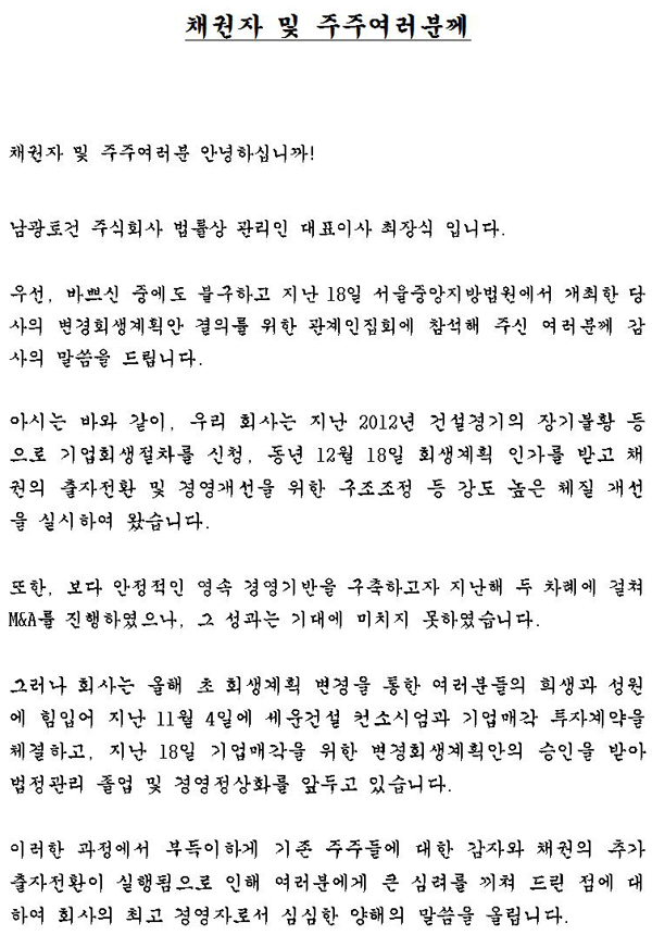 채권자 및 주주여러분께