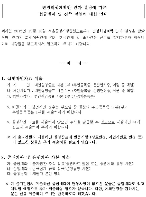 변경회생계획안 인가 결정에 따른 현금변제 및 신주 발행에 대한 안내