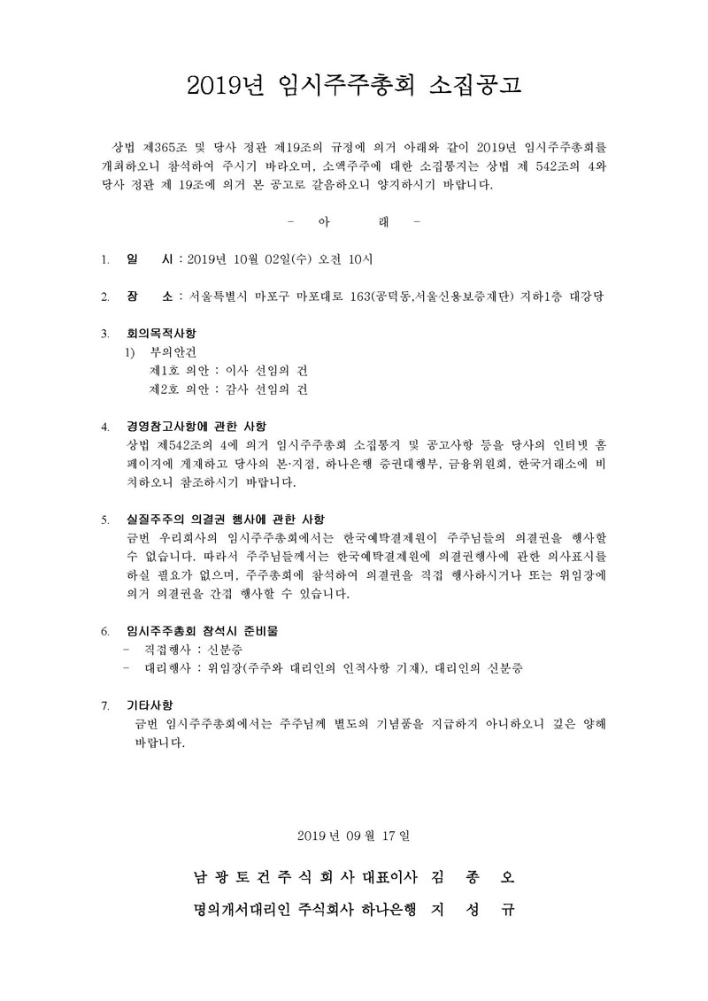 상법 제365조 및 당사 정관 제19조의 규정에 의거 아래와 같이 2019년 임시주주총회를 개최하오니 참석하여 주시기 바라오며, 소액주주에 대한 소집통지는 상법 제 542조의 4와 당사 정관 제 19조에 의거 본 공고로 갈음하오니 양지하시기 바랍니다.