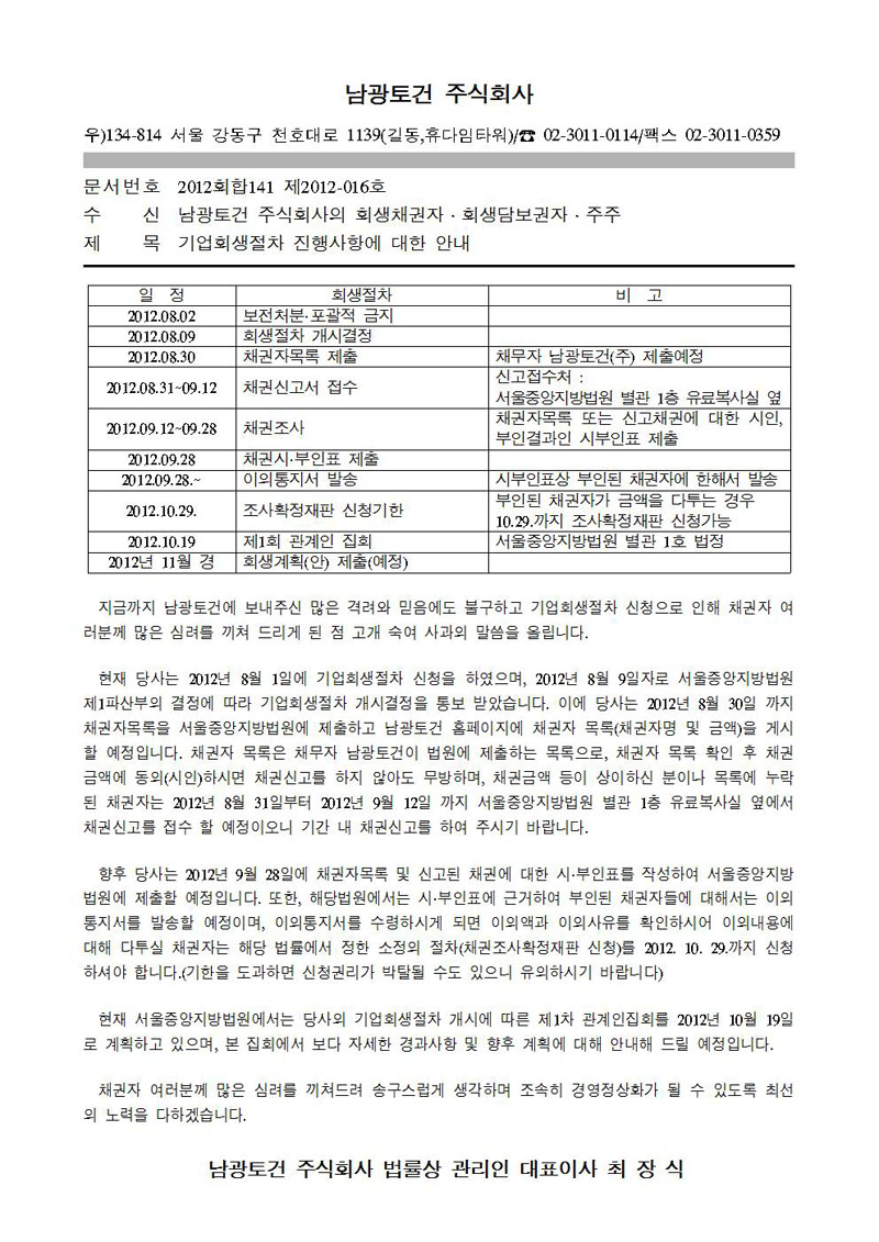 기업회생절차 진행사항에 대한 알림